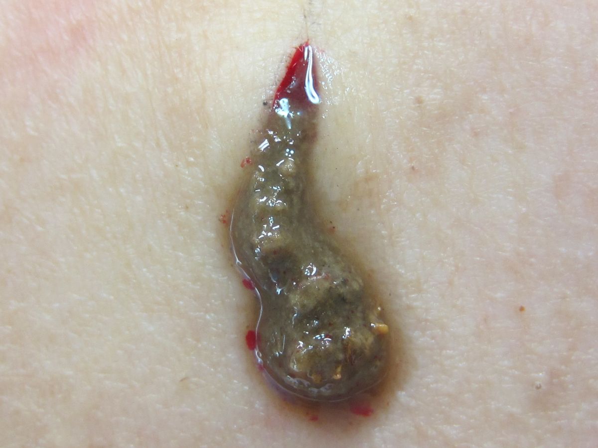 geel, groen of zwart van kleur. Anders dan bij gewone epitheliale cysten (atheroomcysten)