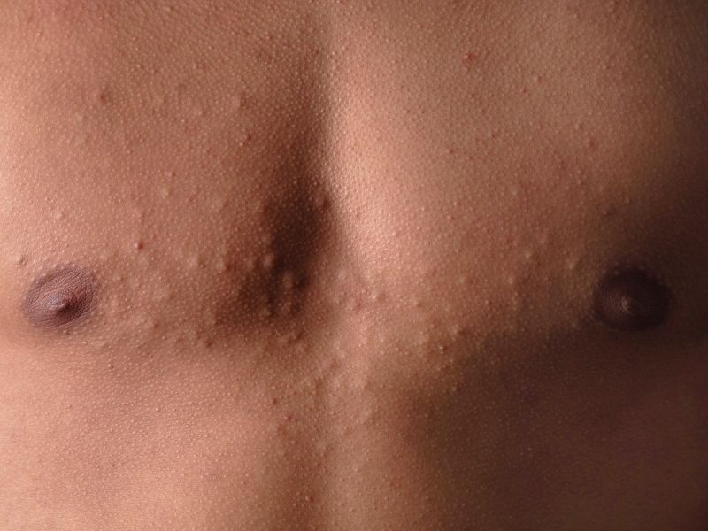 is er geen centrale opening te zien. Voorkeurslokalisaties zijn de borst, nek,