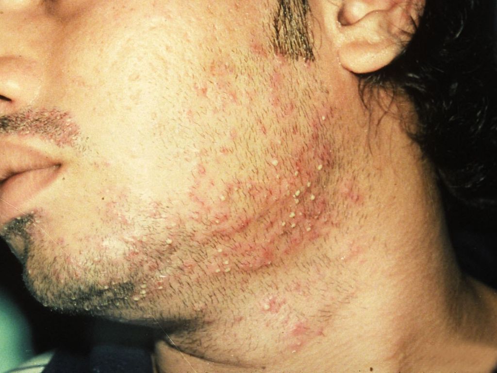 van de baardstreek, overgebracht door vuil scheergerei, en met als belangrijkste