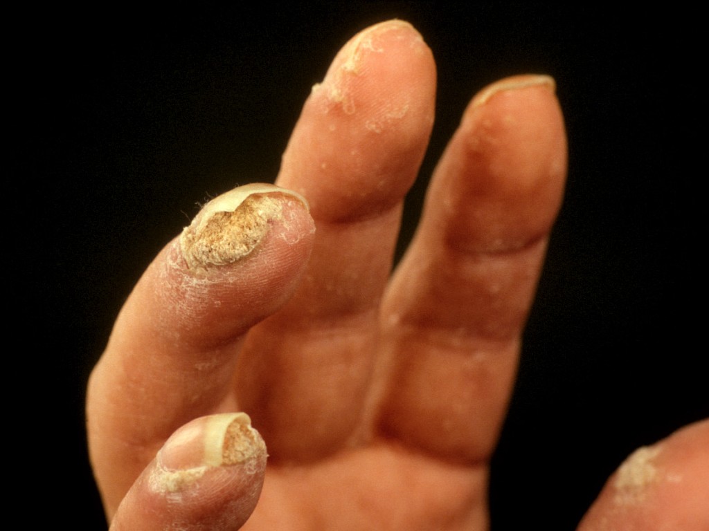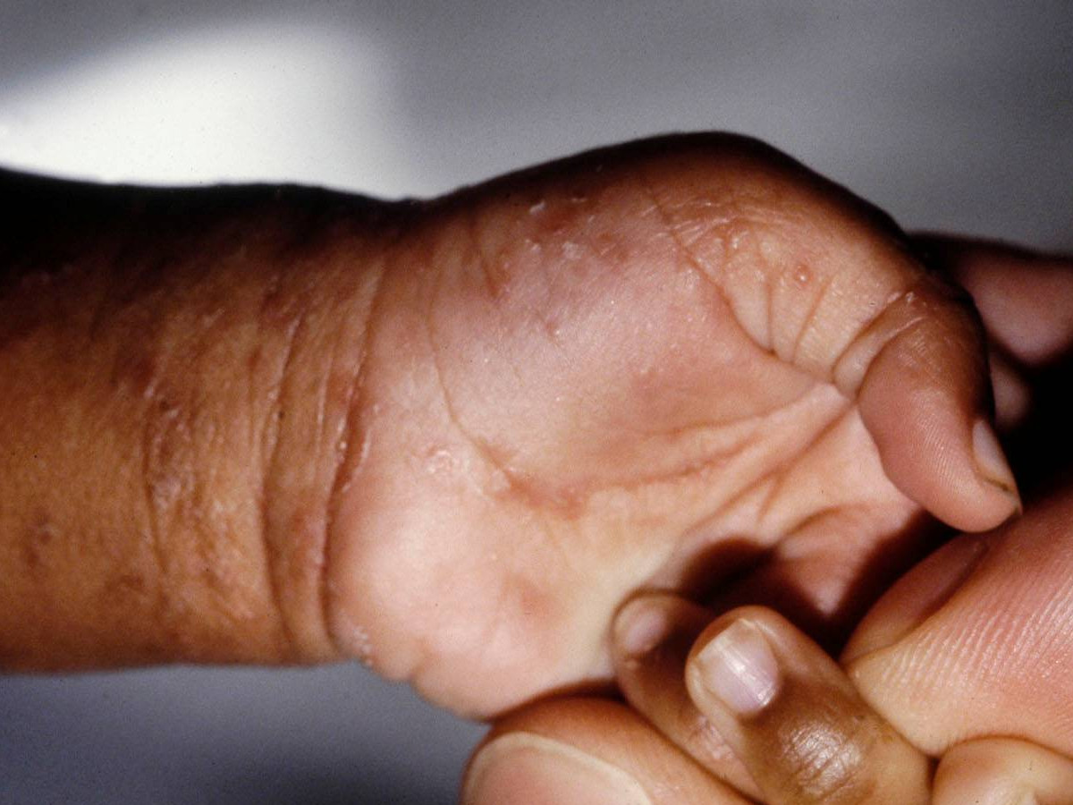 hoofdhuid, handpalmen en voetzolen. De huidschilfers zitten vol mijten en jongere