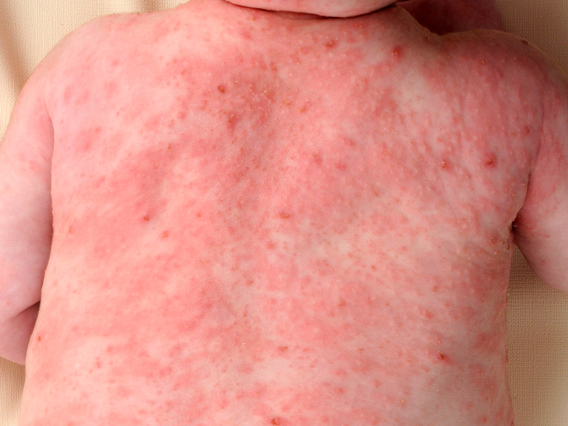 de extremiteiten. Er is een verhoogde kans op secundaire impetiginisatie. Soms