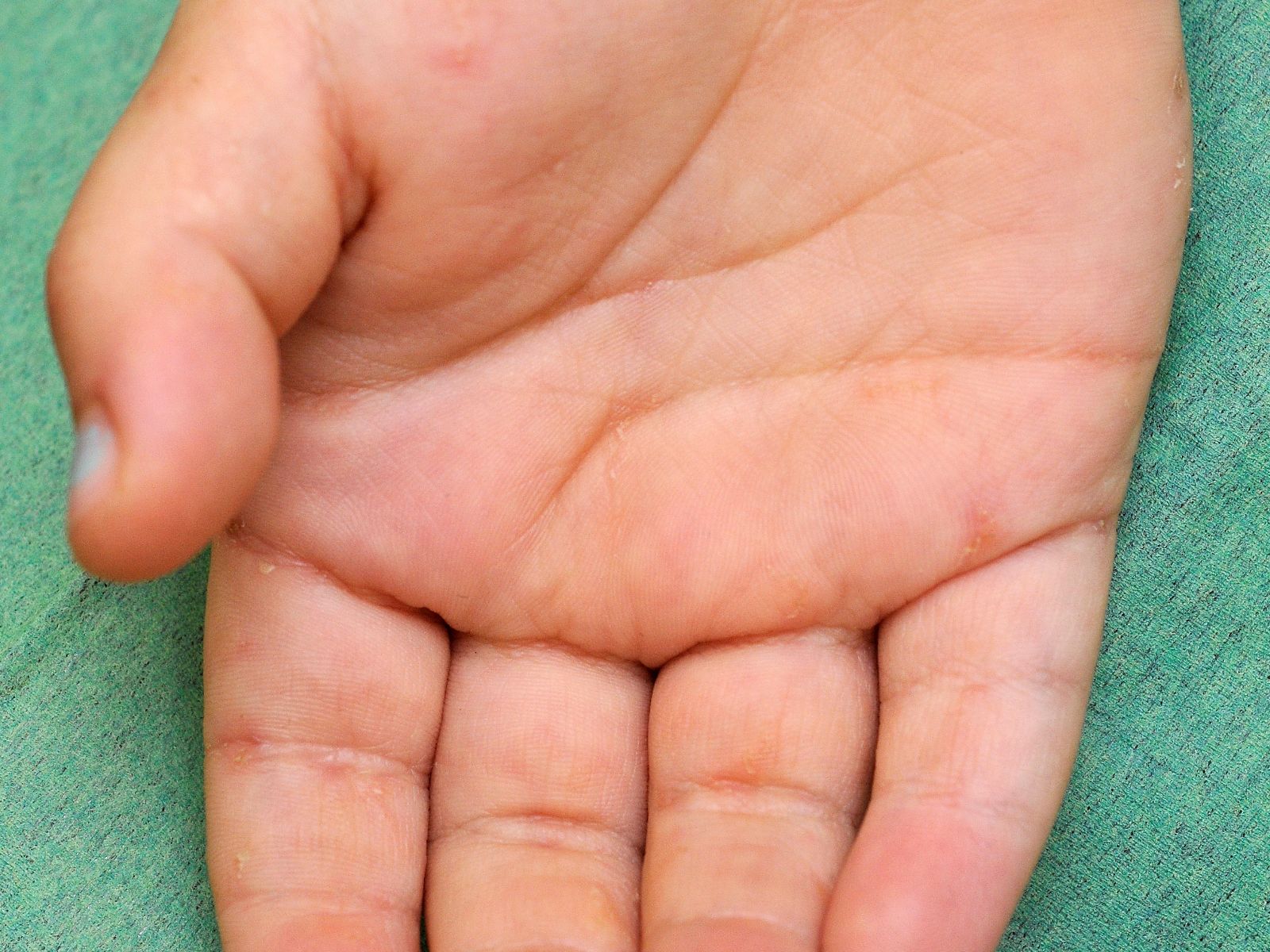 te vinden tussen de vingers, aan de zijkanten en plooien van de handpalm, de