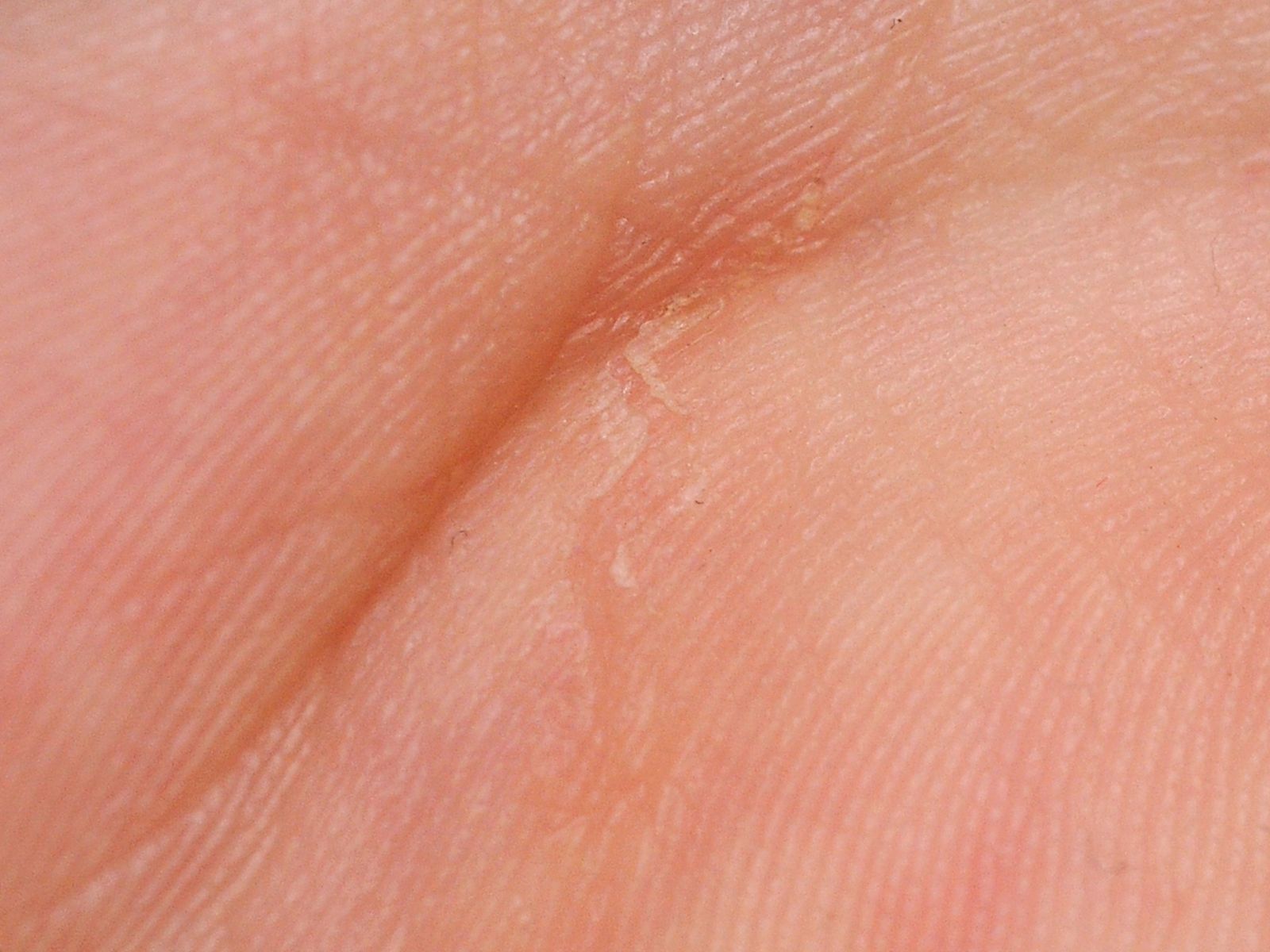 Snij met een mesje de bovenste laag van de huid af. De mijt leeft in de hoornlaag,