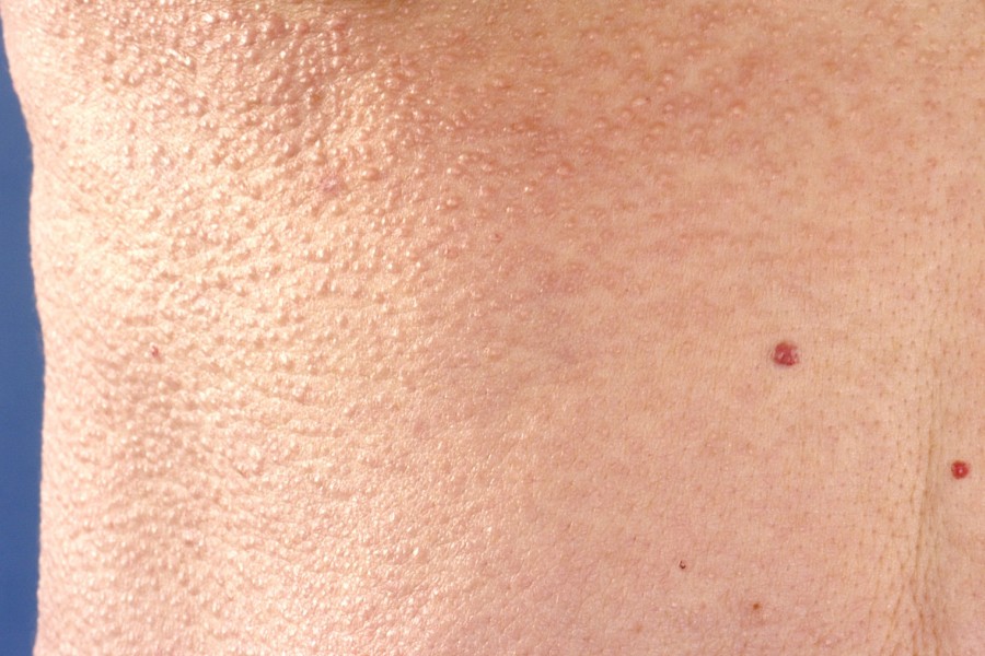 lichaam kunnen voorkomen. Typisch voor de ziekte zijn kleine huidkleurige of