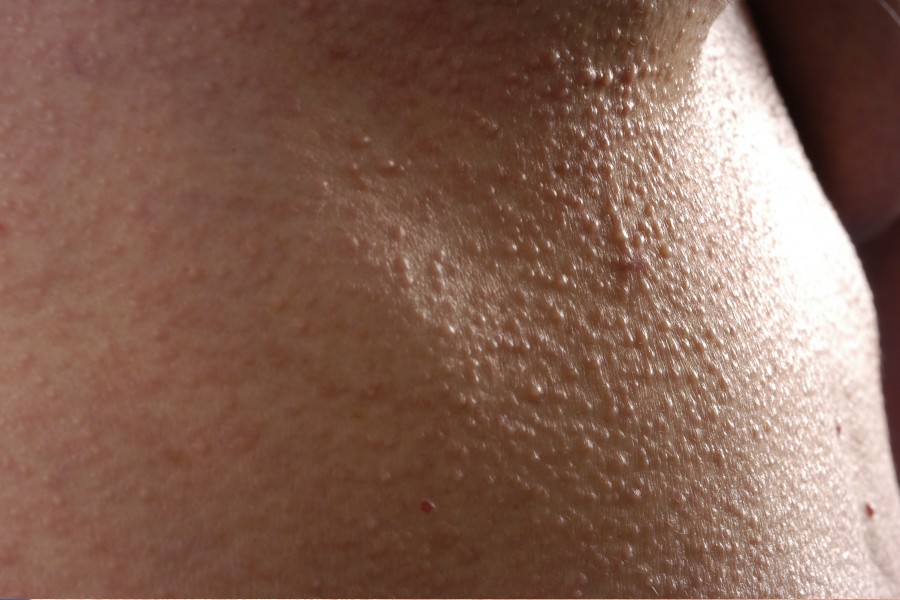 ivoorkleurige papels op voorhoofd, armen, heupen en romp. De papels zijn meestal