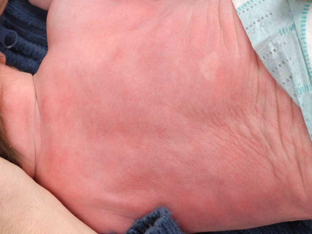 billen en soms wangen, bij neonaten, in de eerste 6 weken. De huid is erythemateus