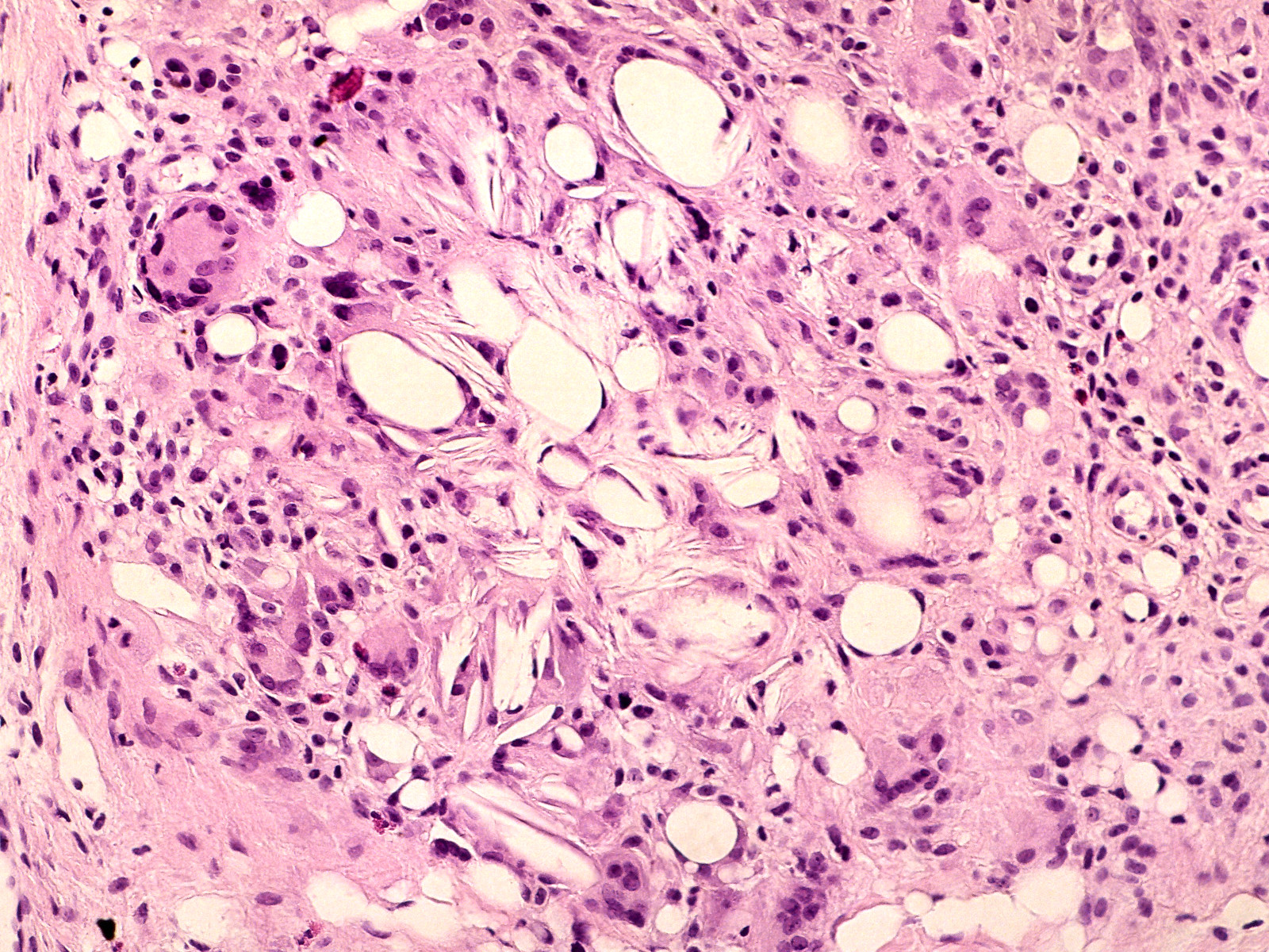 ontstekingsinfiltraat van lymfocyten, macrofagen en reuscellen.