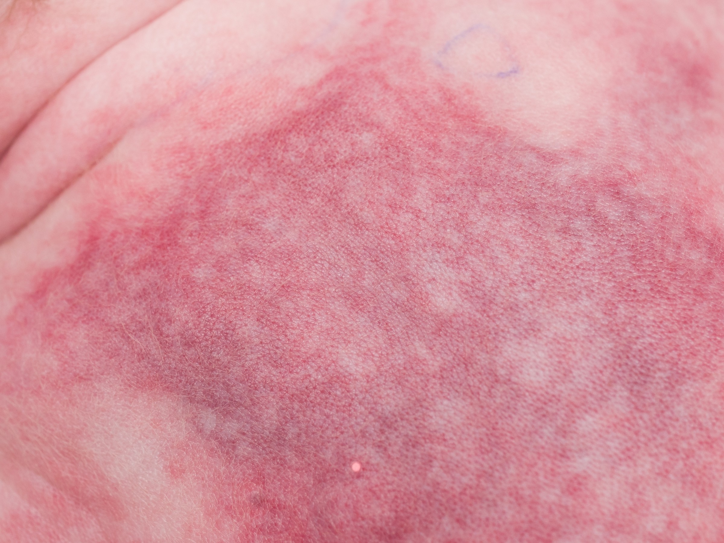of paars en kan oedemateus of geïndureerd zijn, of met een peau d'orange aspect.