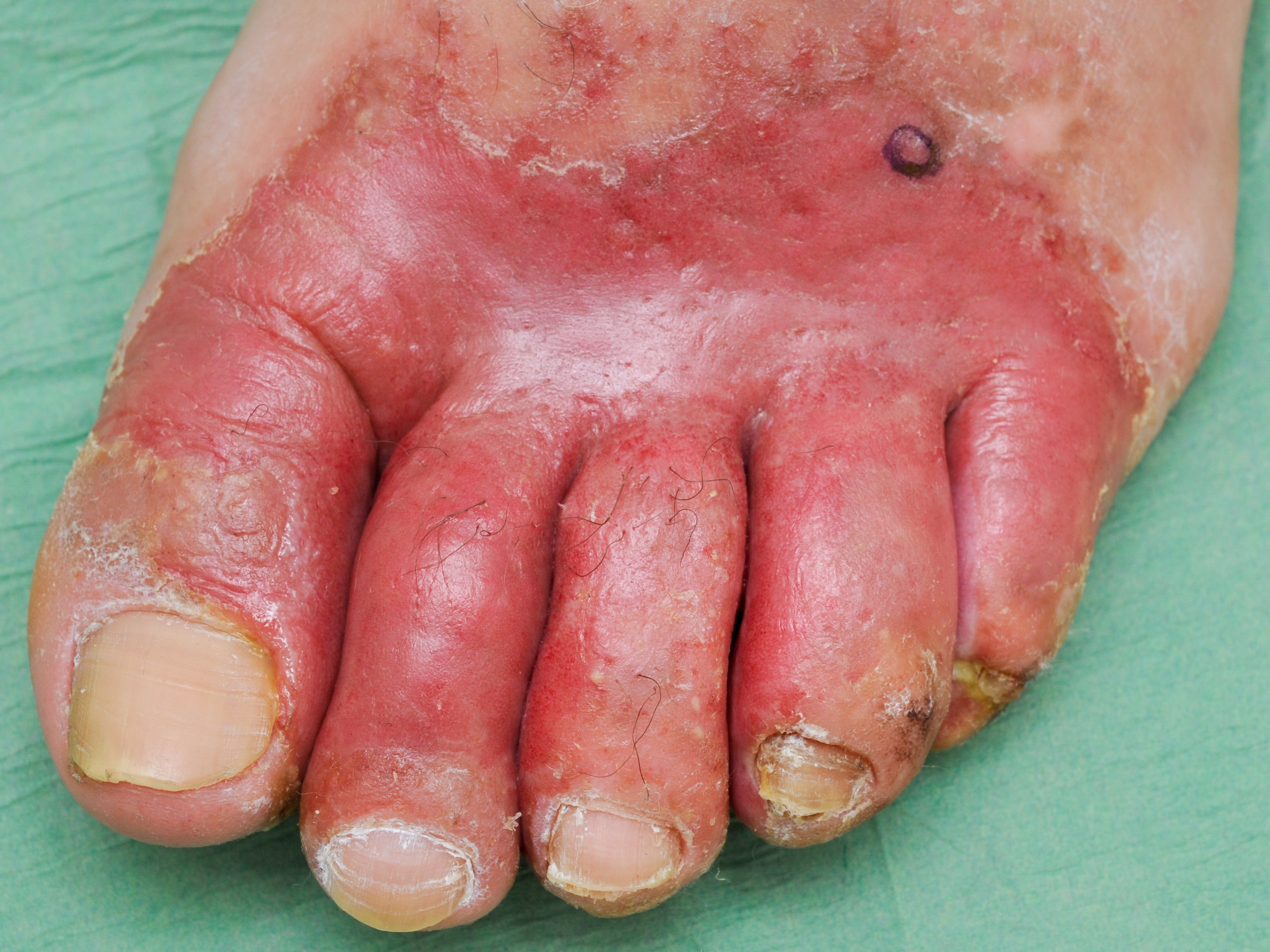 4e interdigitale ruimte, doorlopend tot plantair en dorsaal erytheem, erosies,