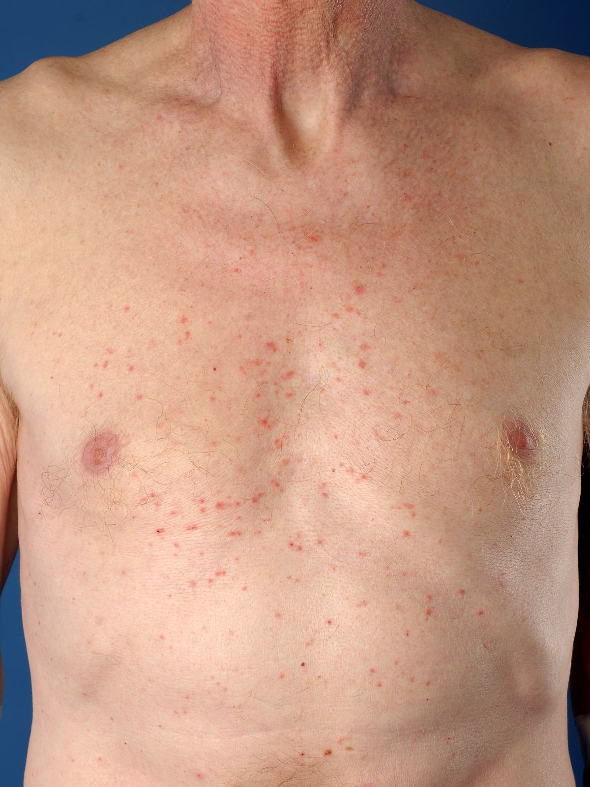 op de romp, typisch submammair, in mannen lijkend op folliculitis. Histologisch