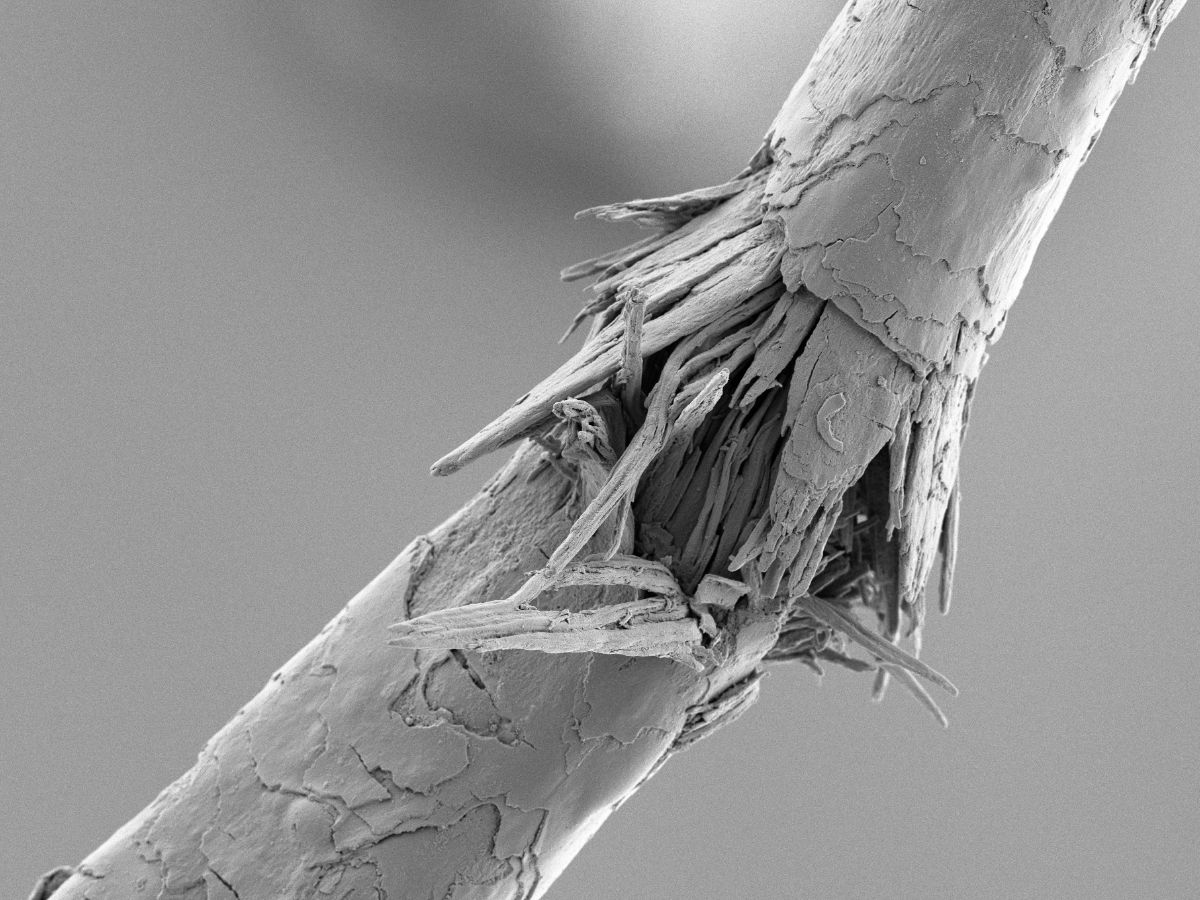 gemakkelijk af. Ter plaatse van de breuk is de haar versplinterd, onder de elektronenmicroscoop