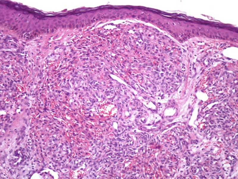 van atypie. De capillaire lumina zijn nauw; hemosiderine pigment kan voorkomen.