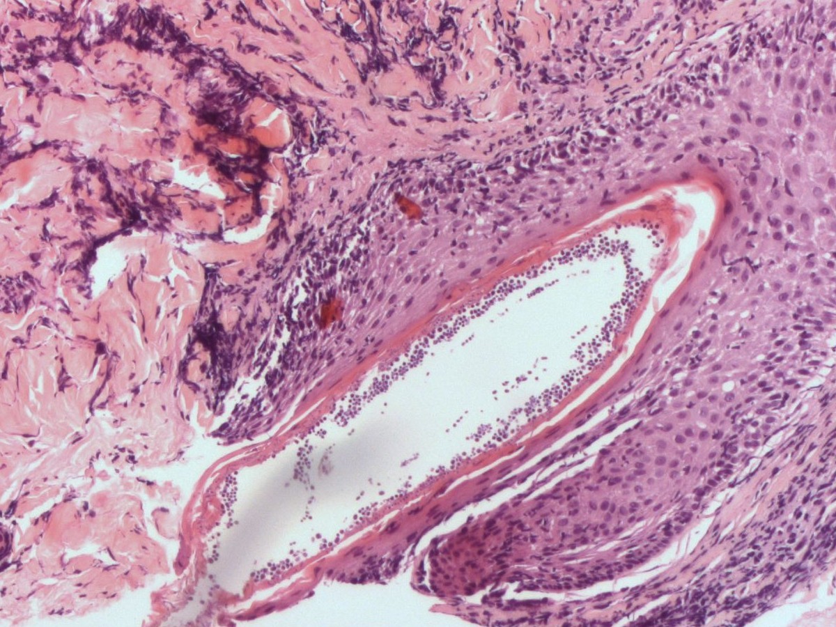 ![Histologie van dermatomycosis barbae, tinea barbae (click on photo to enlarge) [source: www.huidziekten.nl] Histologie van dermatomycosis barbae, tinea barbae](../../../images/dermatomycosis-barbae-PA-3z.jpg) |