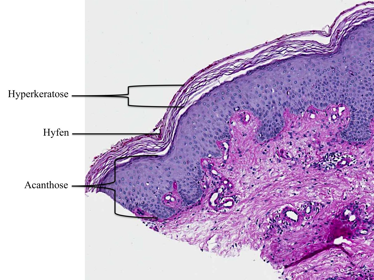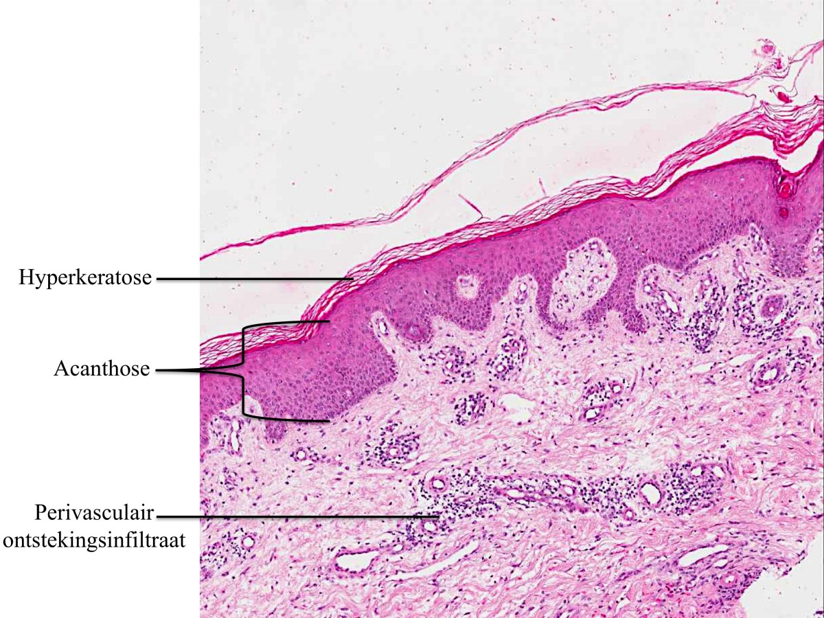 met parakeratose). Afhankelijk van de chroniciteit is er acanthose aanwezig.