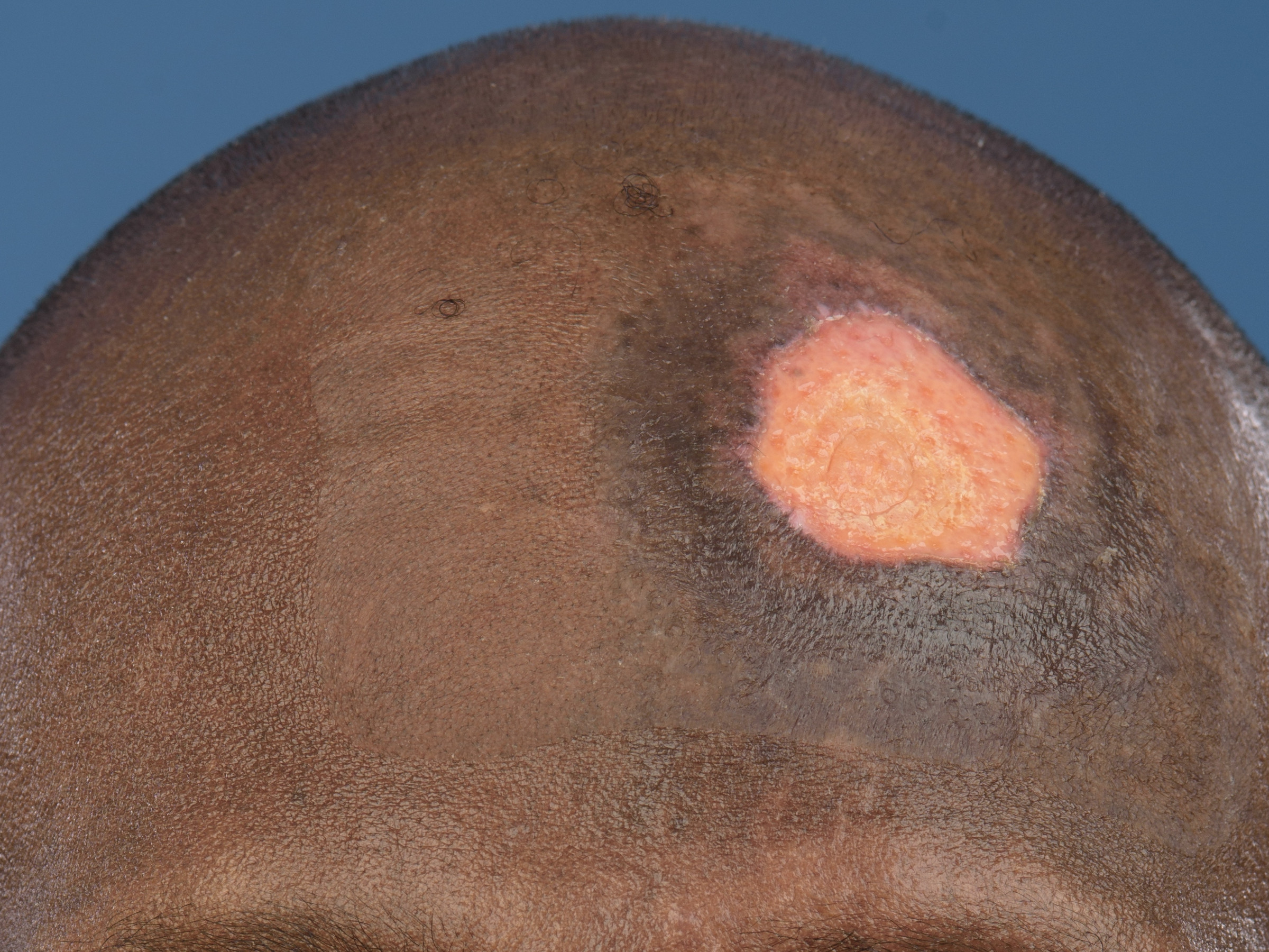 rond het oog of op de schedel (eerste trigeminustak). Het kan een laat gevolg