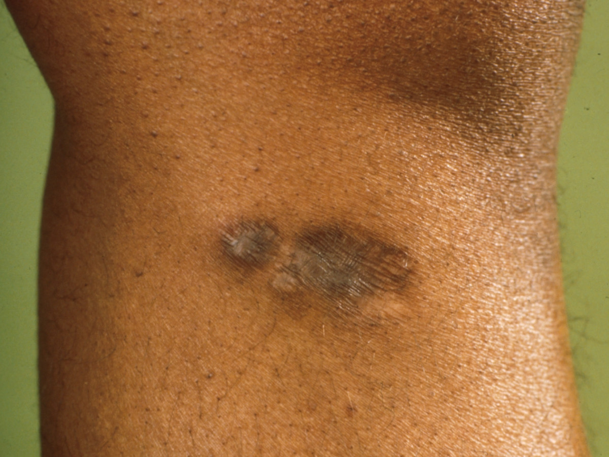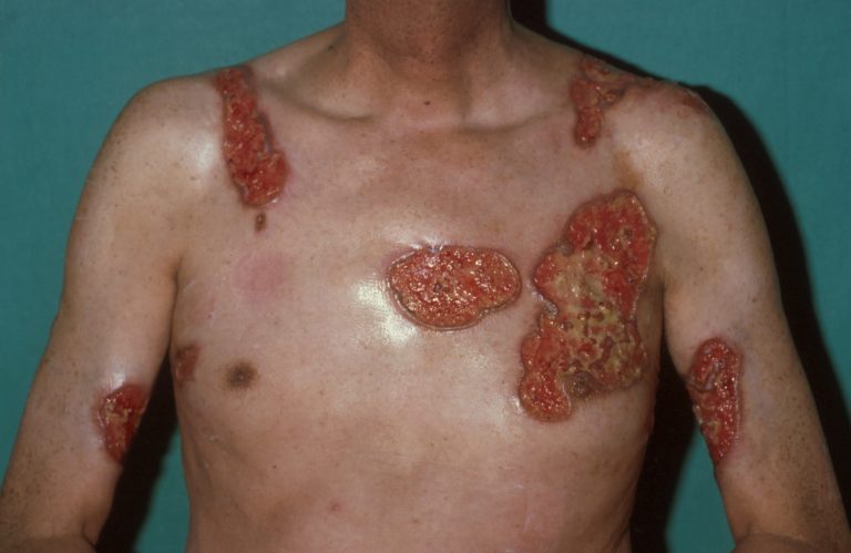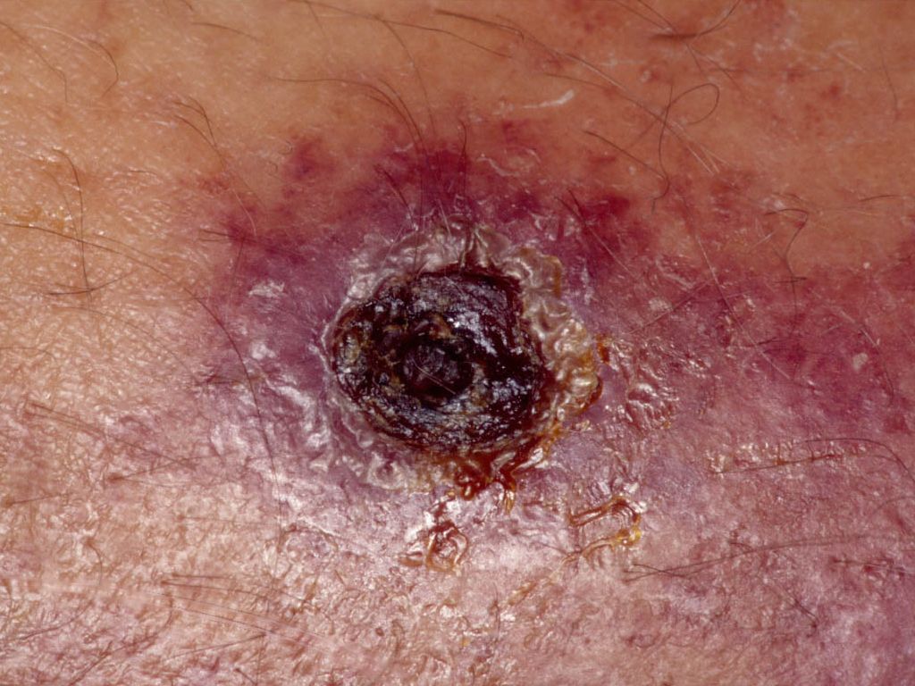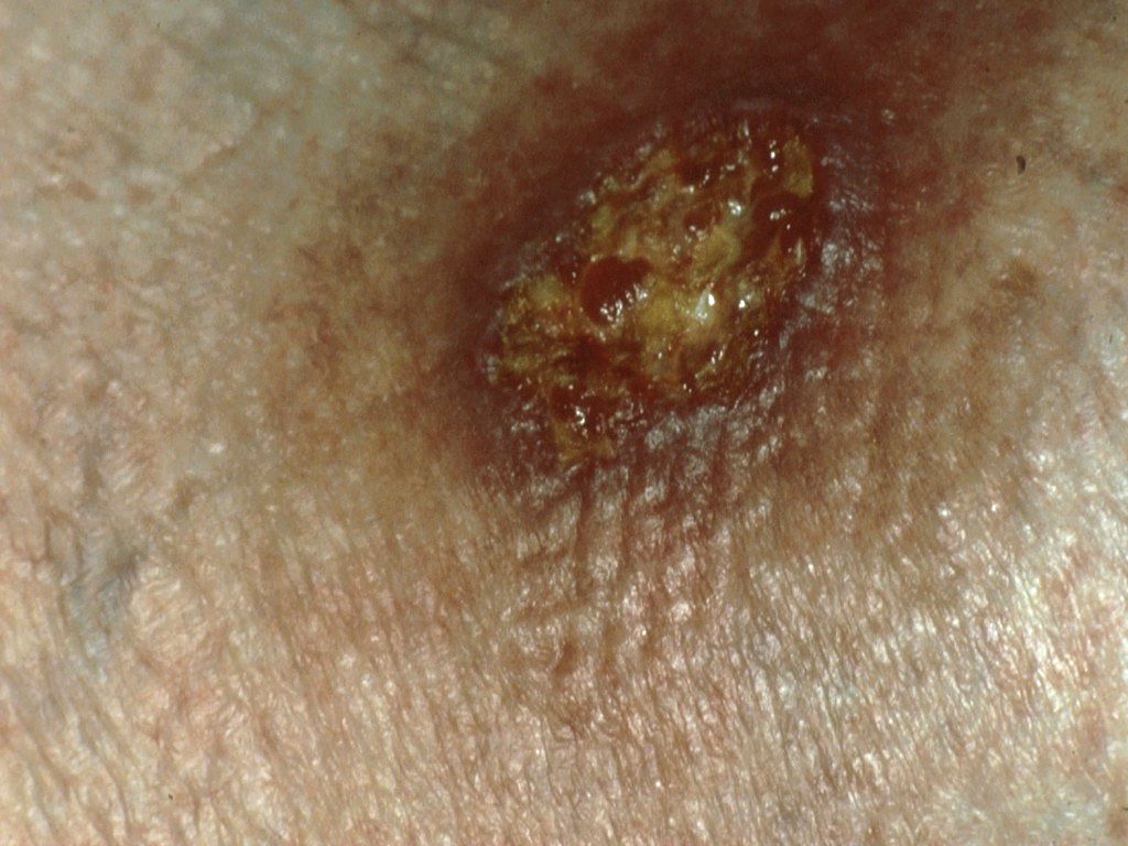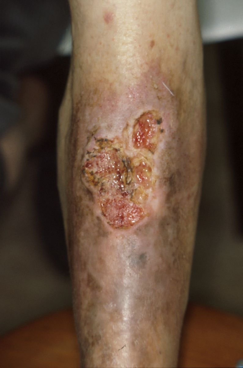 Maligniteiten - basaalcelcarcinoom (ulcus rodens, basocellulair carcinoom) - plaveiselcelcarcinoom (spinocellulair carcinoom) - basosquameus carcinoom - maligne melanoom - metastasen - pseudoepitheliomateuze hyperplasie - verruceus carcinoom (epithelioma cuniculatum, Marjolin's ulcer) - lymfoma, subcutaneous panniculitis-like T-cell lymphoma, leukemie, mycosis fungoides, m. Hodgkin - sarcoom, lymfosarcoom, hemangiosarcoom, lymfangiosarcoom, rhabdomyosarcoom - Kaposi sarcoom (dd: pseudo-Kaposi sarcoom)