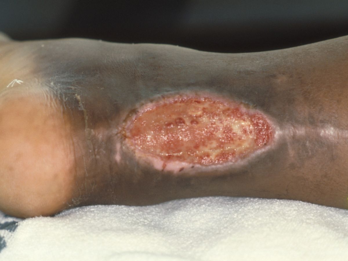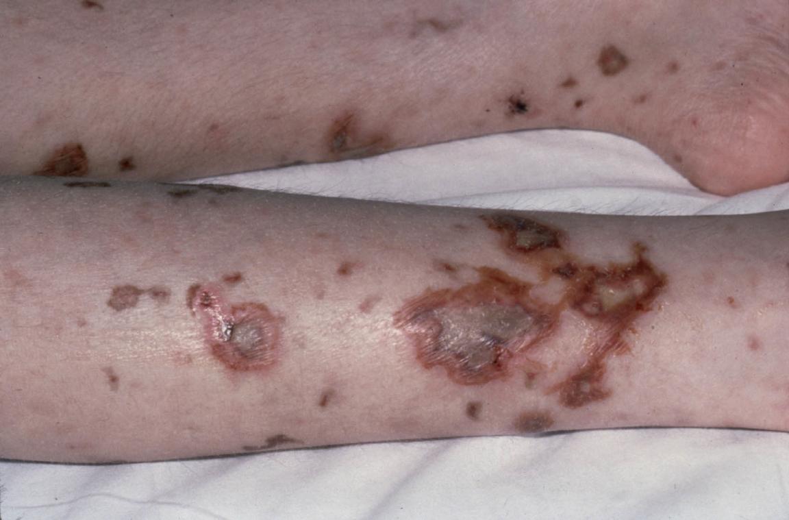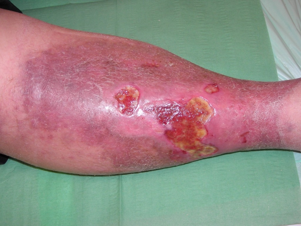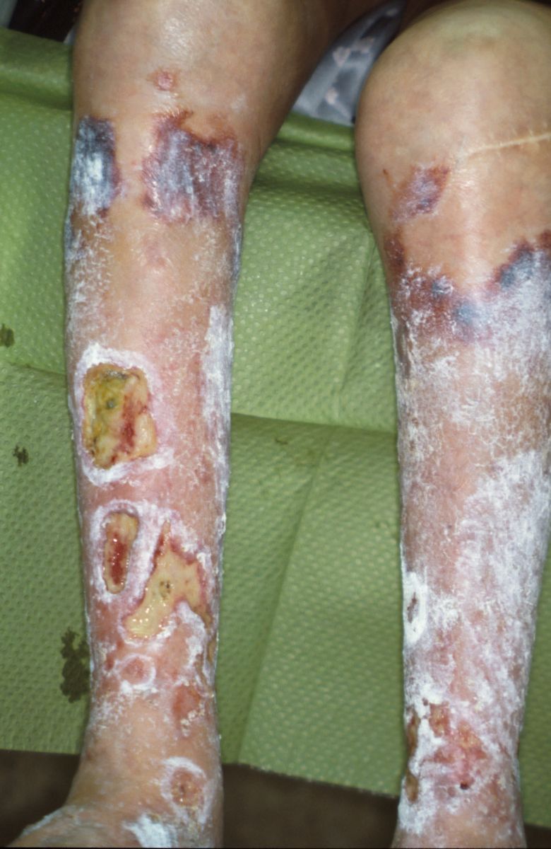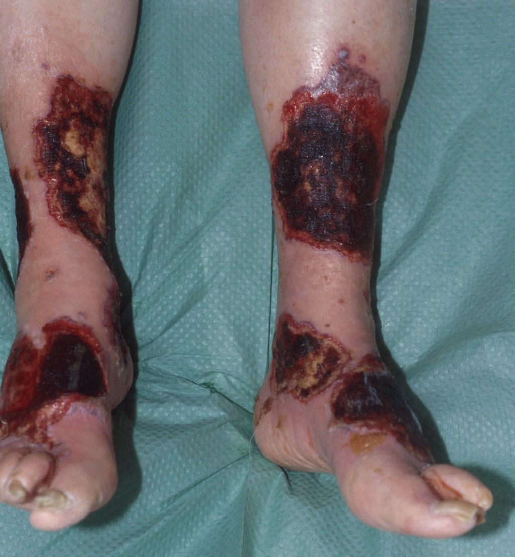Ulcererende huidziekten - pyoderma gangrenosum - pyoderma vegetans - pyoderma vegetans bij hidradenitis suppurativa - vasculitis - panniculitis - periarteritis nodosa - erythema induratum (Bazin) - erythema elevatum diutinum - livedoid vasculopathie - calciphylaxis cutis - calcinosis cutis - ziekte van Degos (papulosis atrophicans maligna) - necrobiosis lipoidica - erythema exsudativum multiforme - Sweet syndroom - parapemphigus e.a. bulleuze dermatosen - m. Behçet - morbus Paget - heftige contactallergie - ulceratieve lichen planus - sarcoidose - SLE en CDLE - ziekte van Raynaud - chilblain lupus - perniones - sclerodermie - keratosis actinica - insectenbeten - trench foot - erytromelalgia - lymfoedeem - lipoedeem - pancreatic fat necrosis - hemangioma - Stewart Bluefarb syndrome - Langerhans cell histiocytosis
