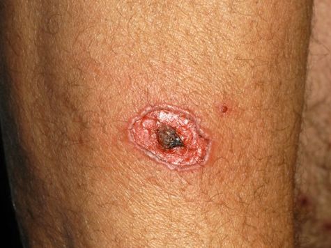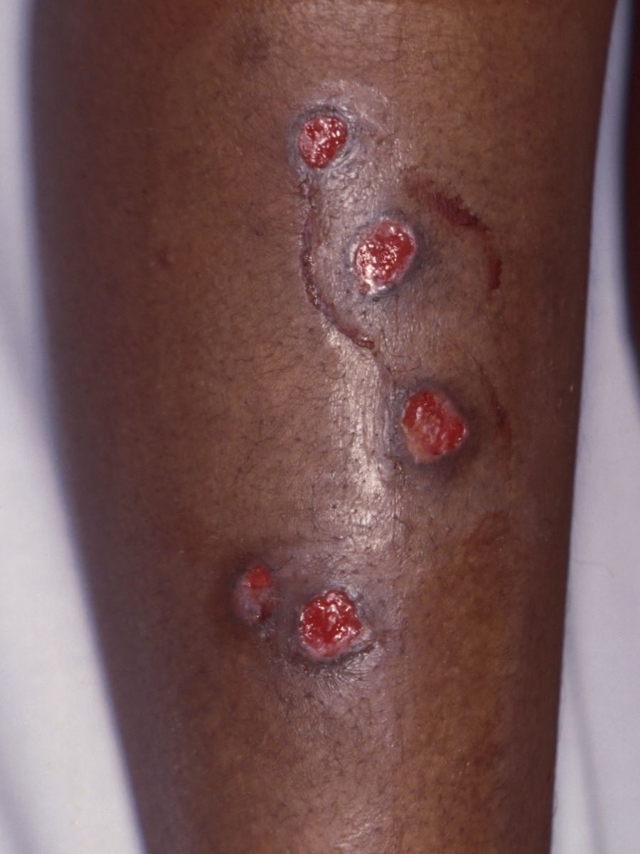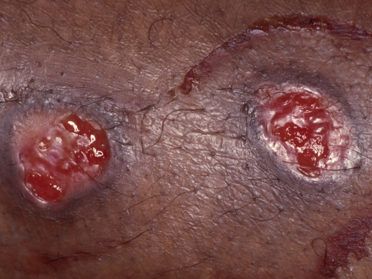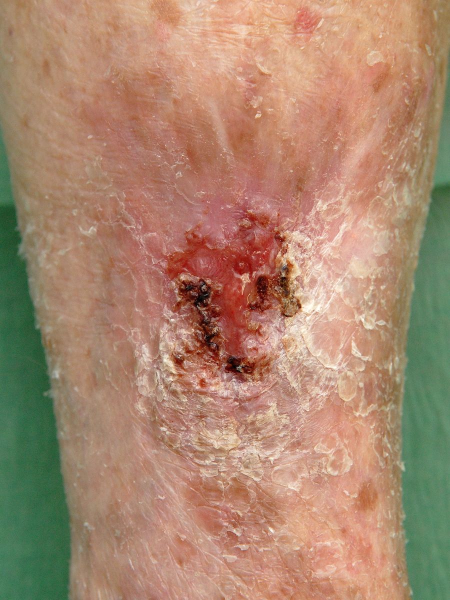 Infectieuze en parasitaire aandoeningen - Streptococcus pyogenes (erysipelas, erysipelas bullosa, ecthyma, fasciitis necroticans, loge/compartimentsyndroom, secundaire wondinfectie) - Staphylococcus aureus (ulcererende pyodermie, impetigo bullosa, secundaire wondinfectie) - Pseudomonas aeruginosa (ecthyma gangrenosum) - Neisseria meningitis (septische embolie, vasculitis, meningococcen sepsis, diffuse intravasale stolling) - Clostridium difficile (gasgangreen, ulcera gelaat en extremiteiten - Corynebacterium diphteriae en jeikeium (cutane ulcera, difterie) - Bacillus anthracis (anthrax, miltvuur) - Treponema pallidum (lues, lues II, lues maligna (lues III, gummata)) - Donovania granulomatis (granuloma inguinale) - Haemophilus ducreyi (ulcus molle, chancroid) - Mycobacterium leprae (lepra, framboesia (yaws)) - Mycobacterium ulcerans (Buruli ulcus) - Mycobacterium kansasi (ulcera extremiteiten), andere atypische mycobacteriën - Mycobacterium marinum (aquarium granuloom, ulcera extremiteiten, knie, elleboog) - Mycobacterium tuberculosis (huidtuberculose, lupus vulgaris, papulonecrotic tuberculide) - Nocardia spp (nocardiosis) - Franciscella tularensis (tularemia) - Bartonella henselae (bacillary angiomatosis) - Leishmaniasis mucocutanea (Leishmaniasis, bos-yaws, Kala azar) - Herpes simplex en Herpes zoster (gegroepeerde vesikels en ulceraties) - Maden (myiasis) - ulcus tropicum (Bacteroides, Borrelia vincenti en andere bacteria, waaronder S. aureus) - diepe mycosen - Cryptococcosis (Cryptococcus neoformans) - Histoplasmosis (Histoplasma capsulatum) - Aspergillosis (Aspergillus fumigatus) - Coccidioidomycosis (Coccidioides immitis) - Paracoccidioidomycosis, blastomycosis braziliensis (Paracoccidioides brasiliensis) - Blastomycosis (Blastomyces dermatitidis) - Chromoblastomycosis (Fonsecaea pedrosoi) - Mucormycosis (Mucoralis species) - Sporotrichosis (Sporotrichosis Schenckii) - Madurafoot (Eumycetes species, Actinomyces) - Entamoeba histolytica (cutane amoebiasis) - Rickettsia species (Rickettsiose, tache noir) - secundaire wondinfectie - osteomyelitis (meerdere micro-organismen) - toeweb infection