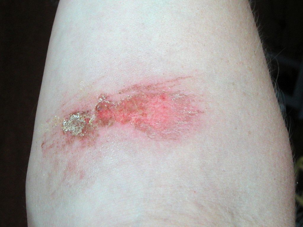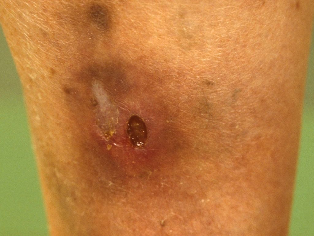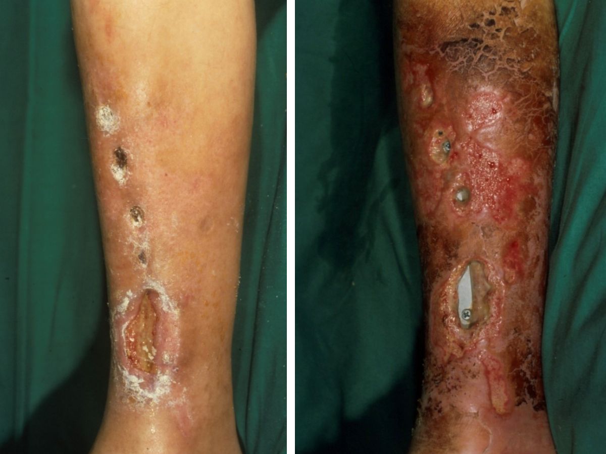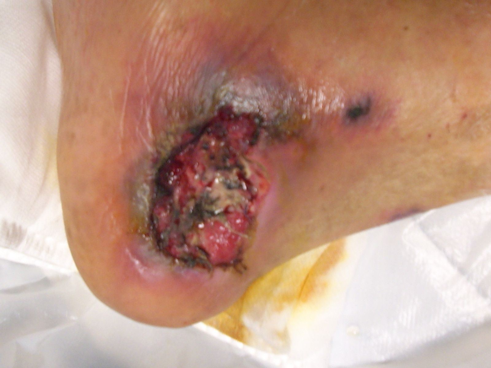 Infectieuze en parasitaire aandoeningen - Streptococcus pyogenes (erysipelas, erysipelas bullosa, ecthyma, fasciitis necroticans, loge/compartimentsyndroom, secundaire wondinfectie) - Staphylococcus aureus (ulcererende pyodermie, impetigo bullosa, secundaire wondinfectie) - Pseudomonas aeruginosa (ecthyma gangrenosum) - Neisseria meningitis (septische embolie, vasculitis, meningococcen sepsis, diffuse intravasale stolling) - Clostridium difficile (gasgangreen, ulcera gelaat en extremiteiten - Corynebacterium diphteriae en jeikeium (cutane ulcera, difterie) - Bacillus anthracis (anthrax, miltvuur) - Treponema pallidum (lues, lues II, lues maligna (lues III, gummata)) - Donovania granulomatis (granuloma inguinale) - Haemophilus ducreyi (ulcus molle, chancroid) - Mycobacterium leprae (lepra, framboesia (yaws)) - Mycobacterium ulcerans (Buruli ulcus) - Mycobacterium kansasi (ulcera extremiteiten), andere atypische mycobacteriën - Mycobacterium marinum (aquarium granuloom, ulcera extremiteiten, knie, elleboog) - Mycobacterium tuberculosis (huidtuberculose, lupus vulgaris, papulonecrotic tuberculide) - Nocardia spp (nocardiosis) - Franciscella tularensis (tularemia) - Bartonella henselae (bacillary angiomatosis) - Leishmaniasis mucocutanea (Leishmaniasis, bos-yaws, Kala azar) - Herpes simplex en Herpes zoster (gegroepeerde vesikels en ulceraties) - Maden (myiasis) - ulcus tropicum (Bacteroides, Borrelia vincenti en andere bacteria, waaronder S. aureus) - diepe mycosen - Cryptococcosis (Cryptococcus neoformans) - Histoplasmosis (Histoplasma capsulatum) - Aspergillosis (Aspergillus fumigatus) - Coccidioidomycosis (Coccidioides immitis) - Paracoccidioidomycosis, blastomycosis braziliensis (Paracoccidioides brasiliensis) - Blastomycosis (Blastomyces dermatitidis) - Chromoblastomycosis (Fonsecaea pedrosoi) - Mucormycosis (Mucoralis species) - Sporotrichosis (Sporotrichosis Schenckii) - Madurafoot (Eumycetes species, Actinomyces) - Entamoeba histolytica (cutane amoebiasis) - Rickettsia species (Rickettsiose, tache noir) - secundaire wondinfectie - osteomyelitis (meerdere micro-organismen) - toeweb infection
