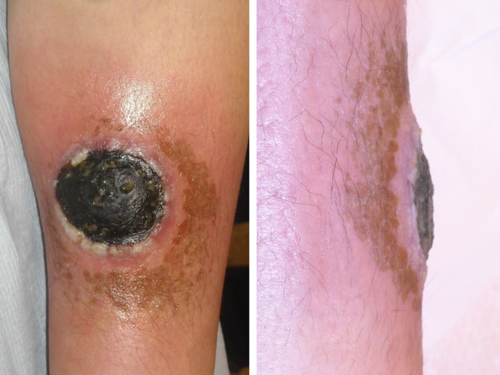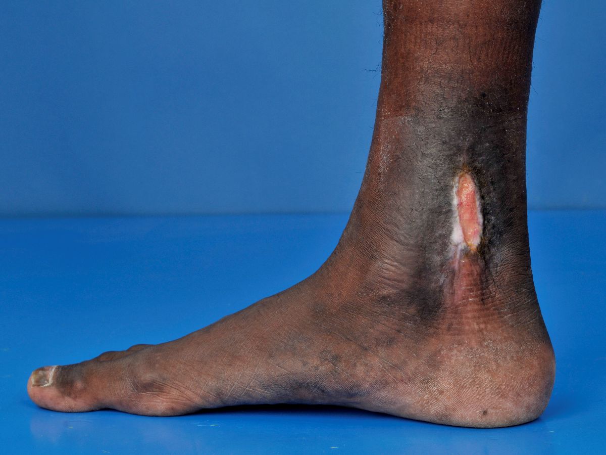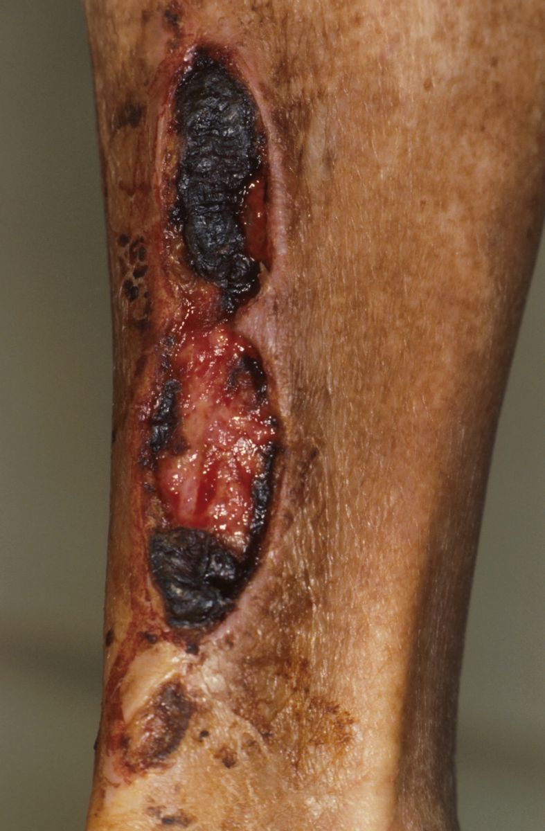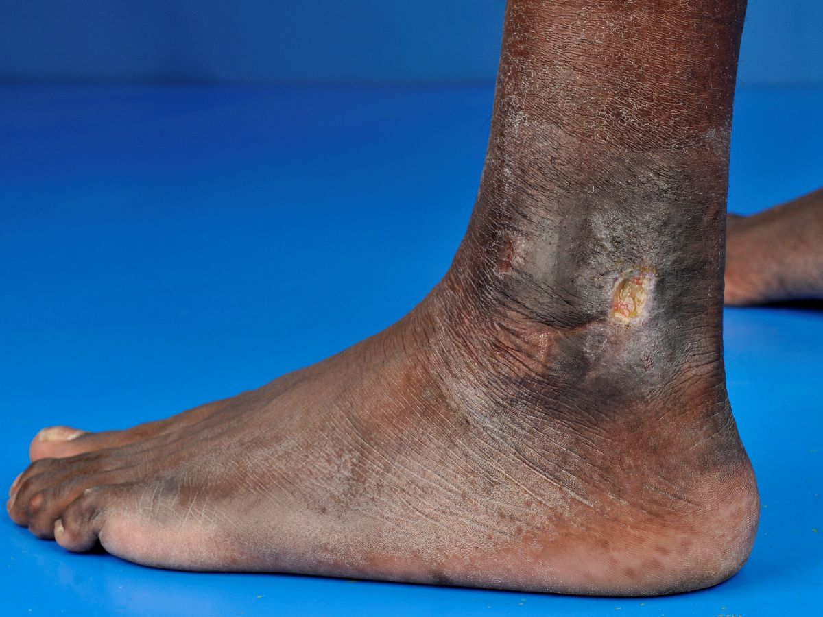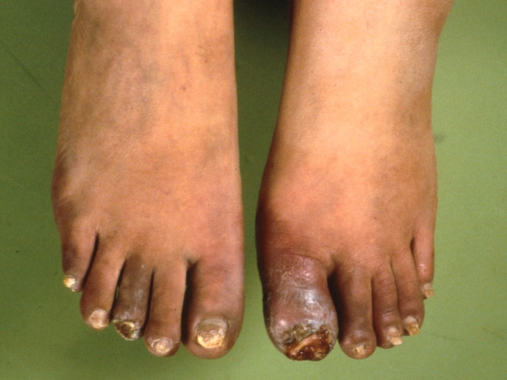 Foto's onder: Ashashyou en AfroBrazilian - Wikimedia (Creative Commons License 4.0). Microcirculatiestoornissen - atherosclerose van kleine arterietakjes en arteriolen - microthrombi - hypertensie, ulcus hypertensivum van Martorell (spasme en trombosering huidarteriolen bij maligne hypertensie) - ziekte van Raynaud, Raynaud fenomeen - sclerodermie - verhoogde viscositeit van het bloed (hoog fibrinogeen gehalte, paraneoplastisch, bloedziekten (paraproteïnen, leukemie) - bloedtransfusiereaktie, diffuse intravasale stolling