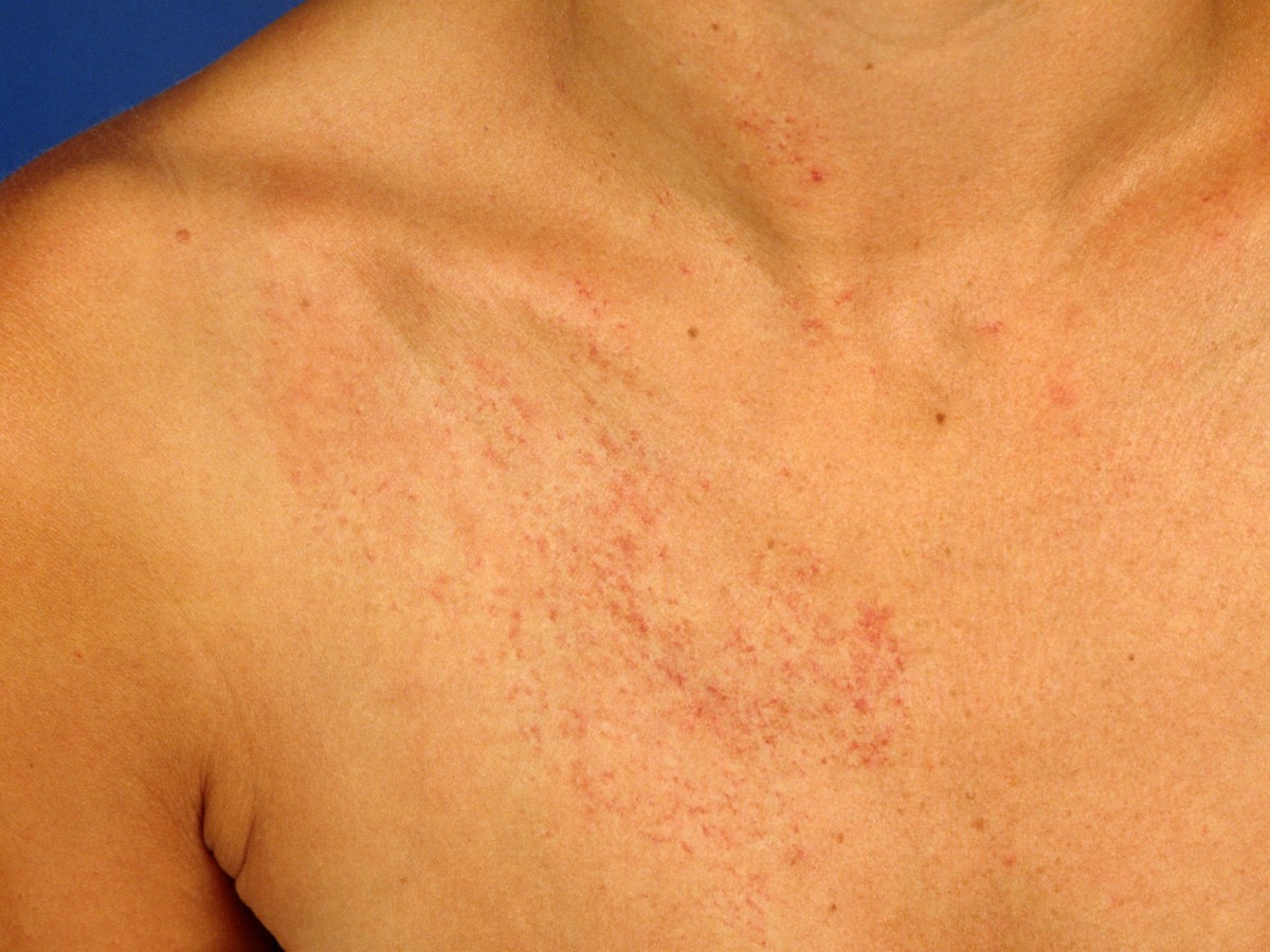 gerangschikte teleangiëctasieën. Meestal in dermatoom 3 of 4 (schouder en arm,