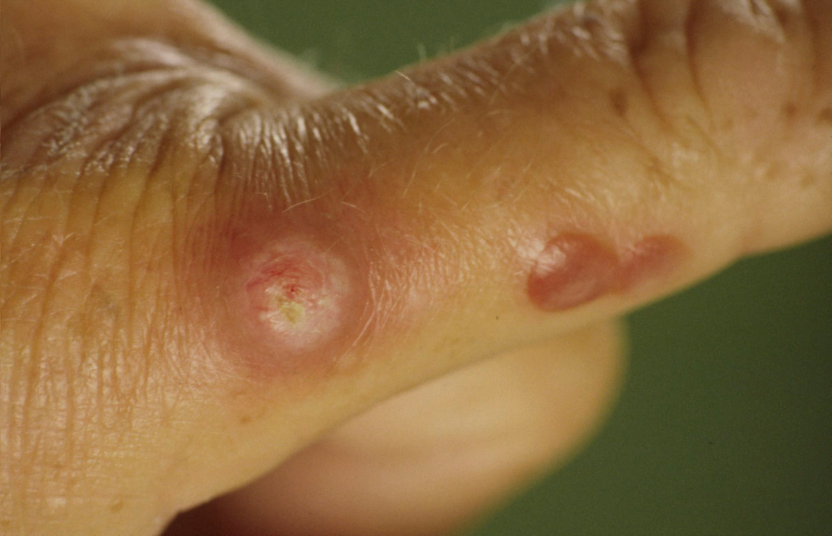 erosies of ulceratie. Het kan secundair infecteren. Soms ontstaat een lymfangitis.