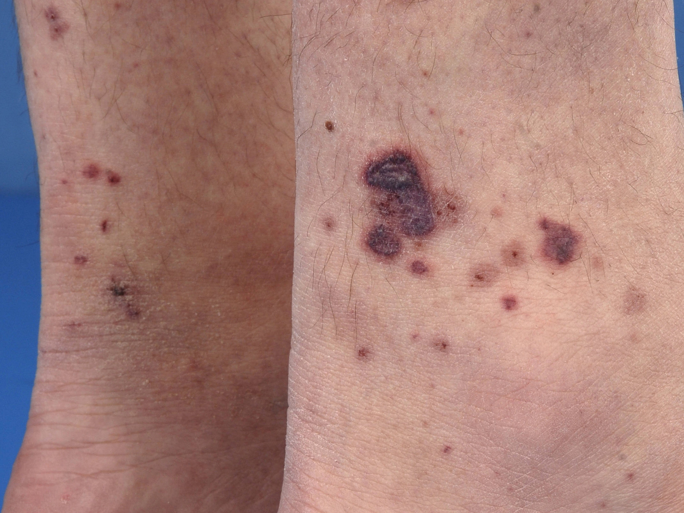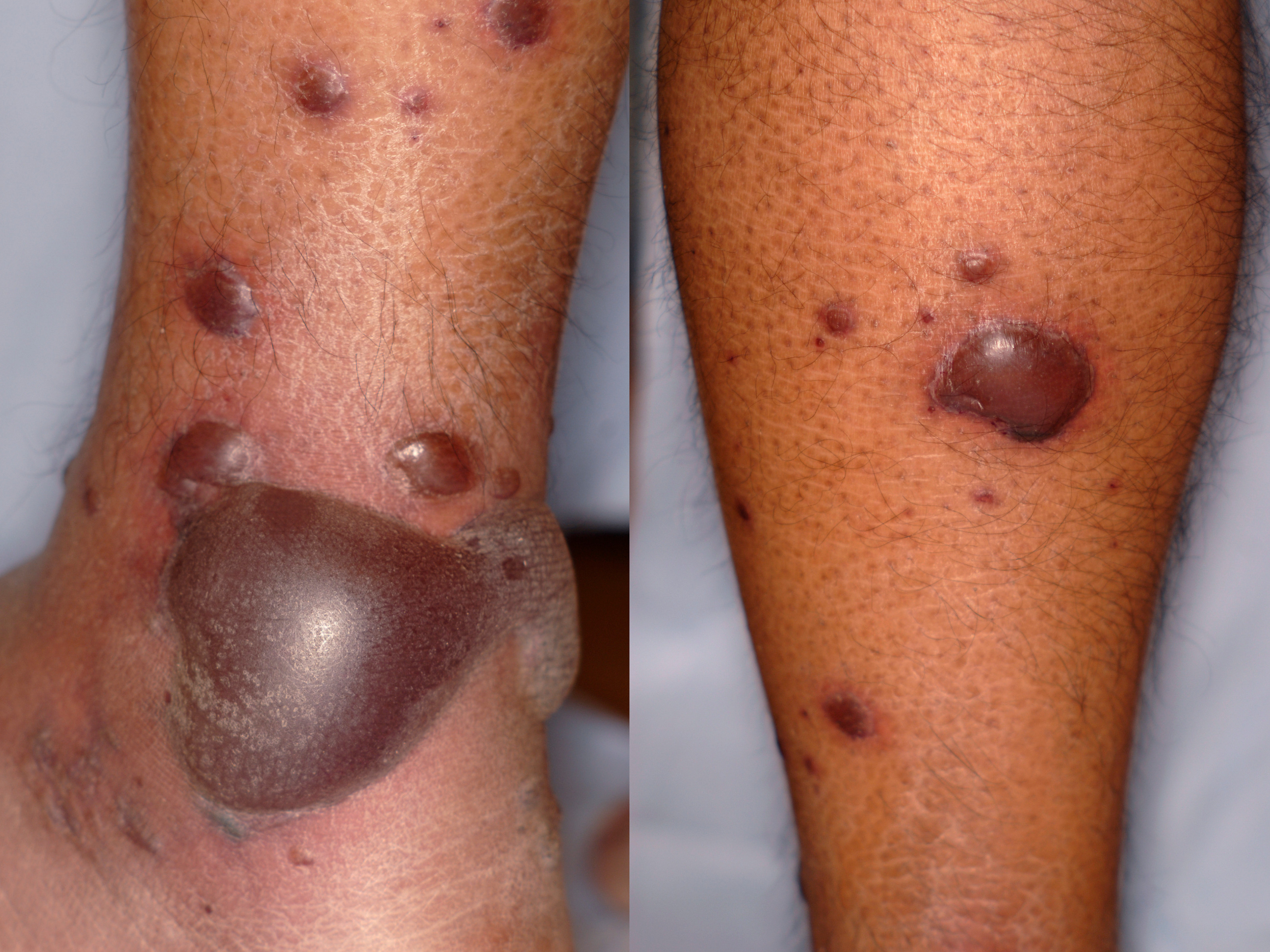 De huidafwijkingen zijn divers: vesiculeuze, ulceratieve en hemorragische laesies,
