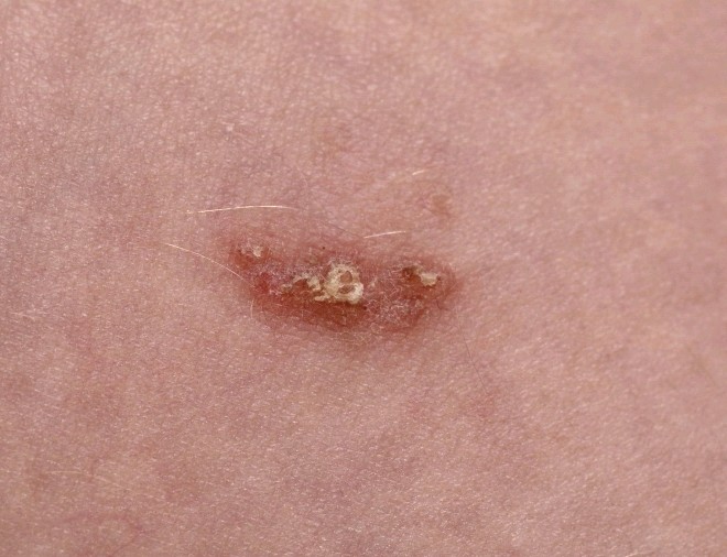 met een hyperkeratotisch of crusteus oppervlak. Meestal solitair. Vooral in