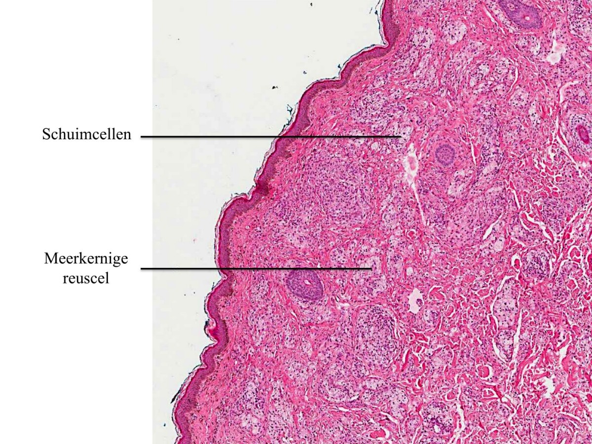 enkele meerkernige reuscellen. Een geringe toename van mestcellen kan gezien