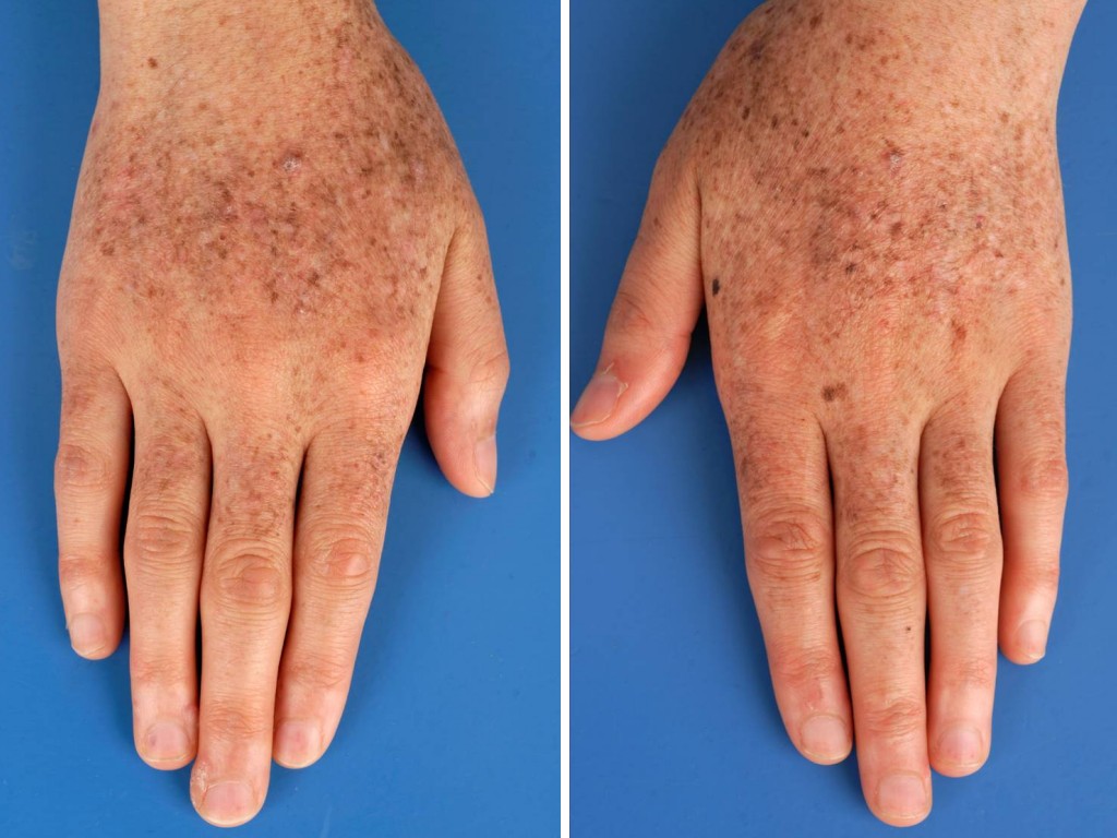 schilfering, sproetachtige hyperpigmentaties op zonbeschenen huid.